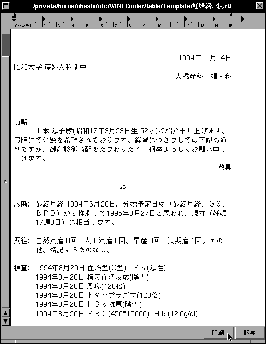 診療中の診断書や紹介状の作成は、診療という流れの中に異質の作業が割り込むということで、結構面倒な作業に感ずる場合が多い。しかし WINE では簡単である。定型文書の種類を選ぶだけのワンタッチでそれらが作成される。あらかじめ用意した定型文書に患者氏名や年齢・住所・診断名あるいは検査結果などを流し込んで、自動作成してくれる。作成された文書は、テキストエデイター機能を持つパネルに表示されるので、必要なら少し手直しをしてプリンターに打ち出し署名するだけでよい。