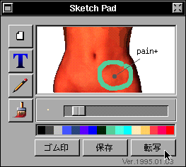 カルテに身体各部位のゴム印を押して略図を書く、ということはよくある。「スケッチ・パッド」で、このような作画ができる。よく使うゴム印のパターンを登録しておき、必要なものを呼び出して簡単な略図や文字を書きそえカルテへ貼りつけることができる。