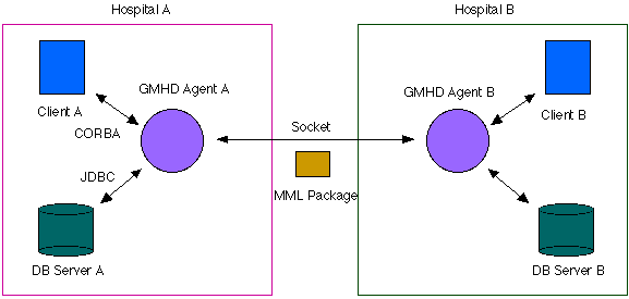 この問題を回避する方法として、クライントの代理(Proxy)をイントラネットサーバー上に置くことが考えられる。この代理クライントをアプリケーションとして実装すれば、アプレットのような制約を受けることなく他のサイトのサーバーにアクセスすることができる。すなわちクライントの検索要求はいったん代理クライントに中継され、代理クライントがGMHDサーバーや他の病院の患者レコードを検索するわけである。我々はこの代理クライントをGMHDエージェントと名付けた。