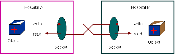 従来ソケット通信と言えば複雑なプロトコルを開発する必要があったが、この方法はそうした事が全く不要であり、あたかもファイルからオブジェクトをリード・ライトするかのごとくソケット通信によってオブジェクトを交換することができる。図3にその概念を示す。