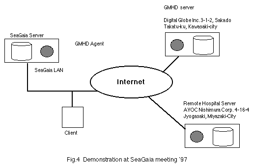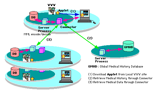 これはアプレットに課せられたセキュリティー上の制約であり、このおかげで我々はインターネット上のサイトに安心してアクセスすることができる。しかしながら、クライントがGMHDのコンセプトにのとって他の病院の患者レコードを検索したいと思っても、直接他のサーバーにアクセスすることは不可能である。