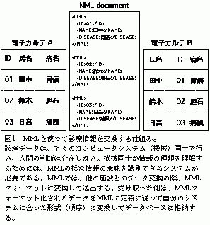 の様に、医学的な意味を明示するタグを用いたほうが処理しやすい。この例で使った<name>、<diagnosis>などのタグを使って医学的な意味を伝える技術、これがMMLである。我々はカルテの論理的な構造を検討し、その中で使用される医学的意味を表わすタグを決め、タグ同士の階層構造を決めた。これにより、SGML/XMLを用いて文書型定義(DTD:Document TypeDefinition)を作ることが出来る。MMLは、診療データ交換のためのDTDに他ならないのである。施設間でデータを交換する場合、MML化されたデータ(MML文書)に変換して交換すれば、正しく医療情報を伝えることが出来るのである。