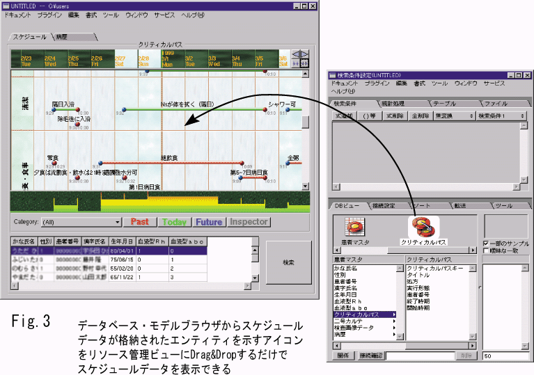 Fig.3は、ある患者の治療計画を示した例である。図中下段のテーブルビューには、前述の方法で患者マスタテーブルが示されており、患者マスタの特定の患者がテーブル上で選択されると、選択された患者の治療計画が遅延ジョインで上段のビューに表示されるというものである。上段のビューは、汎用的なリソース管理ビューとして作られたものであり、開始時期、終了時期の2つの時間データがデータベーステーブル上にあれば、自動的にグラフ化する機能を持つ。このビューへのアソシエーションの指定も図に示すように、データベース・テーブル(図ではクリティカルパス)を示すアイコンを投げ込むだけである。リソース管理ビューでは、2段階のアソシエーション生成が行われる。第1段では、ターゲットテーブルのスキーマに対するデフォルトのマッピングが行われ、第2段では、個々のデータベースによって付加されたアトリビュートへの個別のマッピングが行われる。個別のマッピングが必要なときは、マッピング・インスペクタでDrag&Dropによって行う。