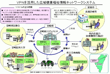 昨年、宮崎県は情報通信基盤整備の立ち後れを挽回し活力ある地域作りを目指し、産、学、官一体となった『次世代宮崎情報ネットワーク協議会』を設立した。この協議会の医療情報システム専門部会が起案し実現した『VPNを活用した広域健康福祉情報ネットワークシステム』の概要について説明する。