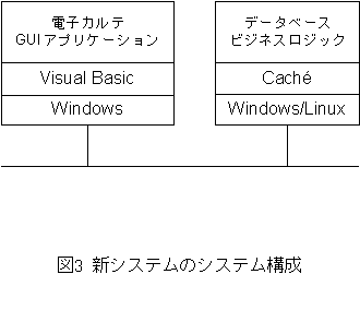従来のシステムは16ビットアプリケーションであるため、これを32ビットアプリケーションに移行する作業を現在すすめています。データベースエンジンは、DTMからCache'(キャッシェ−)バ−ジョン3.1に変更し、それに伴って、ネットワークはNetbiosベースからTCP/IPベースに変わります。この結果、処理速度や安定性が上がることが期待されます。新システムの構成は<図3>の通りです。