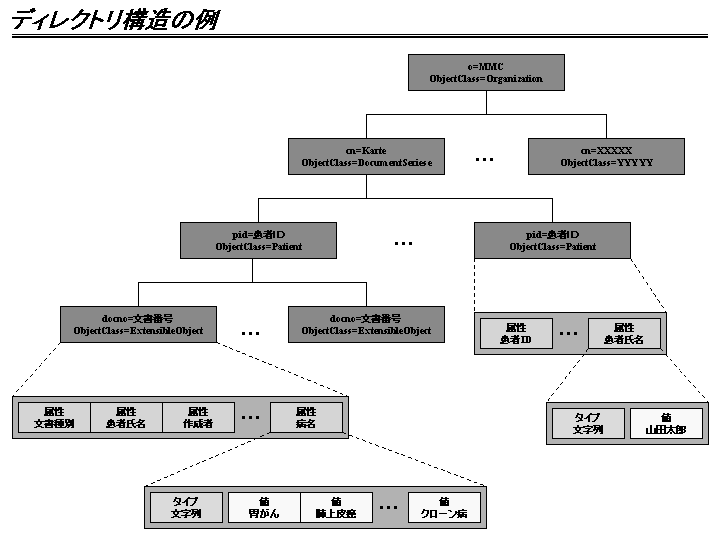 ディレクトリとは所謂フォルダの意味ではなく、英語本来の『登録簿』的な意味である。エントリ(電子カルテでは患者やカルテに相当)とその属性(氏名や病名を表すTAGに相当)の組を階層構造で持つことができる。各属性は複数の値(氏名や病名に相当)を持つ事ができ、属性と値の組により検索する事ができる。検索条件としては"前方一致"、"後方一致"、"部分一致"、"近似値"、"大小比較"等が予め準備されており、これらの条件を組み合わせて検索を行う事が可能である。⇒高いヒット率が期待できる