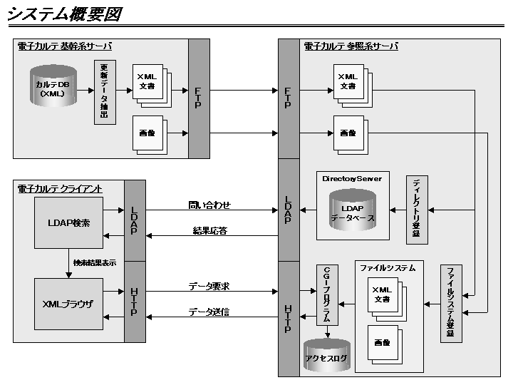 XML文書全体をLDAPのツリー構造にマッピングさせて格納し、参照時に再構築する事も可能ではあるが今回はその様な手法は採用していない。カルテ(XML文書)の実体は完全な形の文書として存在する必要が有るため、LDAPで文書構造を表現する必要は無いと考えたからである。文書構造を表現する為にはXML文書内の各エレメントをLDAPエントリとして登録する必要があるため、検索の性能面でもデータ容量面でも不利である。LDAPはXML文書の実体へのポインタとして使用している。クライアントはカスタムアプリケーションを作成した。複雑な検索フィルタの入力補助や非同期検索、検索結果のソーティング等の機能が必須であると判断したからである。またXML文書の表示にはスタイルシート(XSL)を使用し、参照時に任意のスタイルシートを選択する事を可能としている。