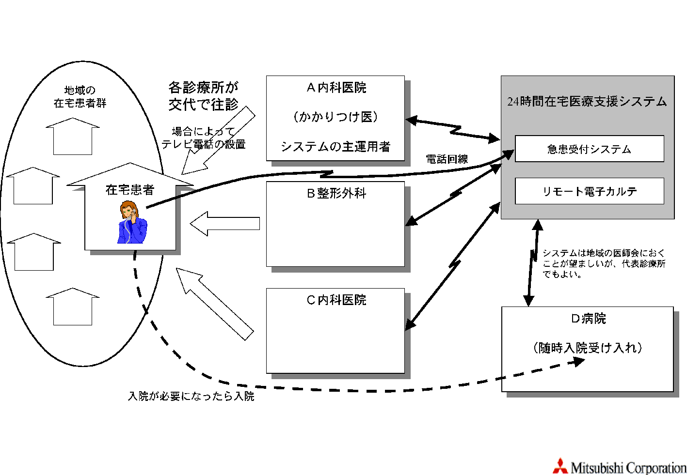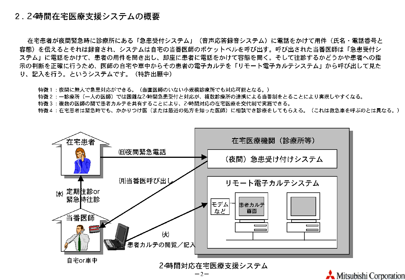 在宅患者が夜間緊急時に診療所にある「急患受付システム」(音声応答録音システム)に電話をかけて用件(氏名・電話番号と容態)を伝えるとそれは録音され、システムは自宅の当番医師のポケットベルを呼び出す。呼び出された当番医師は「急患受付システム」に電話をかけて、患者の用件を聞き出し、即座に患者に電話をかけて容態を聞く。そして往診するかどうかや患者への指示の判断を正確に行うため、医師の自宅や車中からその患者の電子カルテを「リモート電子カルテシステム」から呼び出して見たり、記入を行う。というシステムです。(特許出願中)