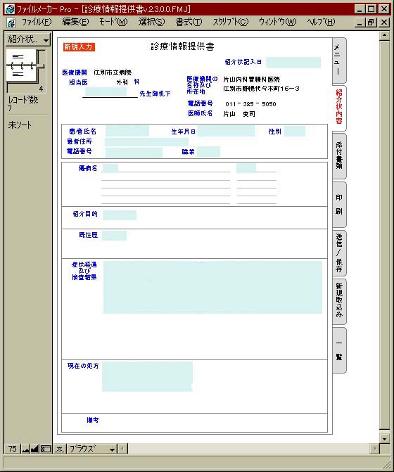 (i)診療情報提供書(様式6)の形式に必要な情報の入力インターフェイスは市販のアプリケーションソフトウェアであるファイルメーカーPro ver.4.1 (FileMaker, Inc.)を使用した(図1).紹介に必要な画像等は外部参照ファイルとして管理した.今回外部参照ファイルとしての画像の管理するためにJava版のイメージビュアーも同時に開発した.
