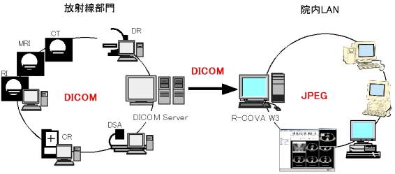 本システムは、DICOMサーバやDICOMモダリティからDICOMプロトコルで受信した画像データを、独自のプログラムでJPEGに変換し、WWWサーバで各クライアントにサービスするシステムです。