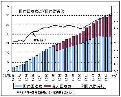 急速な高齢化は国民医療費の高騰をもたらし、医療制度の枠組みを維持することがもはや困難な状況を迎えている。国民医療費は平成11年度には30兆円に達する模様である。自己負担増による受診抑制効果があった平成10年度を除き、ここ10年程度の医療費は毎年平均1兆円、国民一人当たり1万円以上増加している。その牽引役が老人医療費であり、国民医療費に占める割合は約40%、老人一人当たりの診療費は年間70万円、若年層の5倍の水準である。高齢化は、コストの高い年齢層の増加率が高いということを意味しており、将来にわたり不可避な上昇要因である。