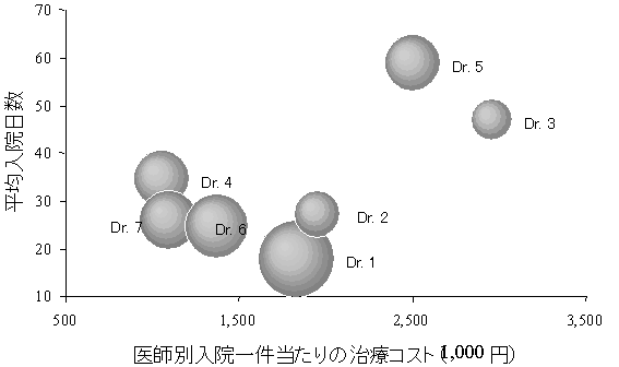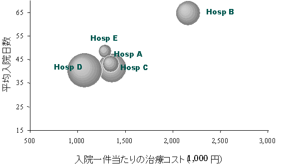 まず診療科レベルの比較を行なう。図3で病院Bは他の病院より右上方に位置する。このことは病院Bの整形外科の平均入院日数、平均コストともに他の病院と比較して高い事を意味する。図の円の大きさは入院患者の数を示す。