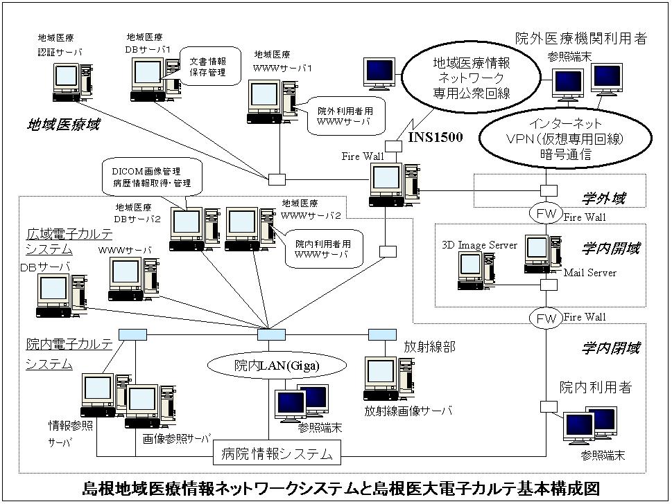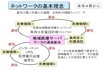 島根地域医療情報ネットワークシステムは地域医療機関と医療情報の相互通信を行うもので、その概念図を図4に示す。島根医大内に地域医療用のWWWサーバとデータベースサーバを設置している(図1)が、このサーバは情報の通過基地としての役割をはたすのみで、データベースとして永久にデータ保存はしていない。必要な情報はここを経由して各自の医療機関で保存するのが原則になっている。島根地域医療情報ネットワークシステムと島根医大附属病院との情報共有の関係は図1に示した通りである。患者情報を取り扱うので、盗聴、改竄、なりすまし、否認、破壊の防止のために、インターネットとは別の地域医療用の公衆電話回線を用い、大学側はINS1500(MAX2000,20チャンネル・ディジタル・モデム)を用意し、会員制の閉鎖ネットワークとしている。会員は、本院に電話して図1の認証サーバにログインすれば認証される。ここでの個人認証は会員番号と時間同期式ワンタイムパスワードで行う。地域医療WWWサーバでの認証は会員番号と通常のパスワードで行う。全体として二重チェック方式を採用している。閉鎖ネットワークであるので、通信時のデータの暗号化はしていない。しかしながら、本学と遠く離れた医療機関と通信するには電話代もかかり不便であるので、本年3月末にVPN(Vertual Private Network)を導入した。これは情報を暗号化して仮想専用回線でインターネット上を通信するもので、地域の病院内の端末でも通信が可能である。6月にはMAC端末でも利用可能になるとのことで、暗号通信に多くの期待が寄せられている。