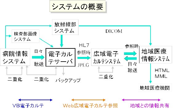 本学の情報ネットワークシステムの概要は図1に示したような構成で、セキュリティは学外域、学内開域、学内閉域(附属病院域)、地域医療域の四層に分かれている。学内閉域の中に、1)病院情報システム、2)電子カルテシステム、3)広域電子カルテシステムがあり、その先の地域医療域にC地域医療情報ネットワークシステムがある。医療情報は図2に示したように、1)→2)→3)→4)を経て、地域医療機関と情報通信が行えるようになっている。データベースは、1)と2)はU-Mumps、3)と4)はCache’を使用している。