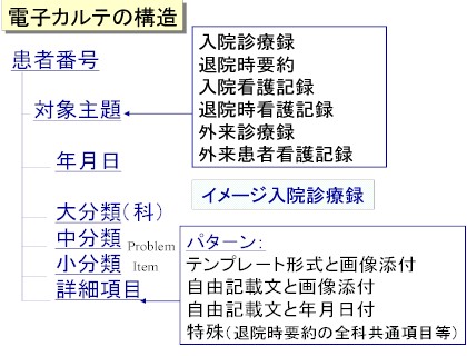 本学の病院情報システムは、医事会計システム以外は診療系6台、部門系2台、検査系2台、計10台のSUNワークステーションで構成されている。各々はプライマリ・ミラーのペア構成をなしている。データベースはU-Mumpsである。今回、診療支援機能として表1の機能を充実させている。情報検索はオンラインでどこの端末からでも検索可能である。表1で*印のあるものには画像(線画、デジタルカメラの写真、CT画像等)を含んでいる。超音波は本年4月稼動。退院時要約には全科共通項目と診療科別独自項目がある。経過記録も同様。退院時要約の診療科別独自項目と外来・入院経過記録の構造は図3の様になっている。必要な情報を即座に取り出せるように、データは短く分割し、階層構造に連結している。