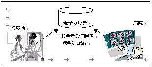 具体的には、医療における診療録(カルテ)の情報を電子化し、共通のデータベースセンターで運用することで情報を複数の医療機関で共有することの有効性を検証する実証実験である。