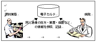 医療機関および調剤薬局で発生する情報を一元化し共有することで、患者に対するサービス向上を検証する。電子カルテ上にある患者特有の情報や過去の薬歴・病歴をオンライン参照することにより、薬剤師による適切な服薬指導および患者の薬に対する正しい理解を期待できる。