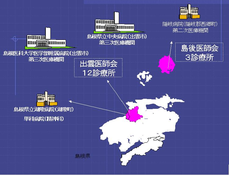 (1)三次医療機関である島根県立中央病院を中核として、医療機関間をネットワークで結び、情報参照支援ツールを共同利用することで病診・病病・診診連携を実現します。これら医療機関間のネットワーク連携を通して地域全体の医療の質を向上させ、患者サービスを高めることを目指しています。