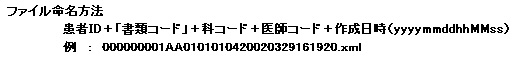 各システムからXMLファイルを図1のような命名規約に従い命名し,所定の監視フォルダーに出力する.このようにファイル名を命名するのは,同じ名前のファイルが存在しないようにするためである.また書類コードは,表1のように取り決めている.