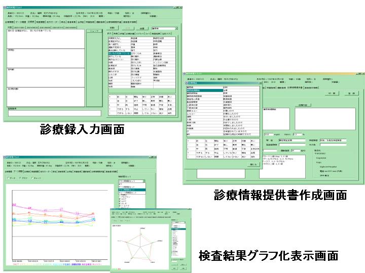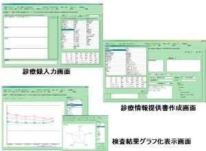 各医療機関に配置され、Virtual Private Network (VPN)を介して、診療情報の入出力を行う。入出力された全ての診療情報は、各医療機関の糖尿病電子カルテシステム内に暗号化(秘密鍵による3DESアルゴリズム)して保存し、同時にデータセンターに送信、保存する。本システムの入力情報は、診療行為の記録のみとし、利用者認証及び電子署名は(3)利用者認証システム、(4)診療情報公証システムの機能による。糖尿病診療における「高頻度使用語彙集」や「高頻度使用シェーマ」を格納し、SOAP記載方式とした糖尿病内科診療録入力画面に加え、糖尿病領域眼科入力画面、糖尿病領域腎臓科入力画面、一般内科入力画面を備え、さらに「糖尿病合併症情報画面」、「生活習慣記載画面」(以上診療録に含む)、「処方箋作成画面」「栄養指導・運動指導処方画面」、「糖尿病診療情報提供書画面」など糖尿病診療に必要な画面を開発した(図1)
