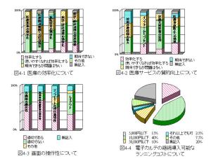 協力医療従事者へのアンケートでは、病院経営の効率化や医療連携に対する診療情報の電子化への高い期待が存在した反面、医療業務の効率化に対しての評価は低かった(図4-1)。今回はオーダーリングシステムや医事会計システムとの接続は行なわなかったために二重に手間がかかったことも一因と思われた。医療サービスの質的向上についての質問では、モニター画面を活用した患者説明や診療支援、医療事故防止などに期待がもたれていた(図4-2)。画面の操作性に関してはレイアウトやテンプレート項目などには今後改善の余地があると考えられた(図4-3)。継続的に導入すると仮定した場合のランニングコストは55%の医療従事者が月あたり1万円以下という低コストを希望しており、運用の効率化が求められているといえる(図4-4)。