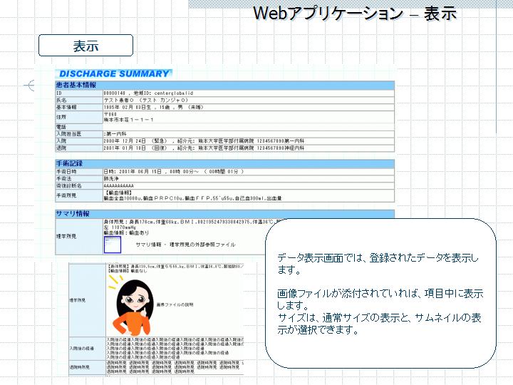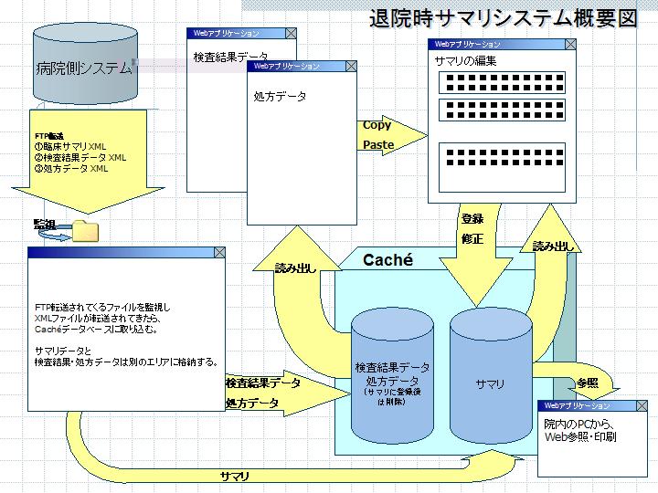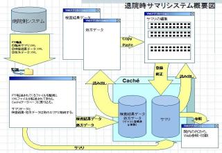 具体的には病院情報システムやオーダリングシステムから患者情報を、データ形式としてa)XML(MML)として受け取る、b)CSVファイルとして受け取る、また形態としてもa)直接LANで受け取る、b)フロッピーディスクなどで受け取る。その際必要な項目(患者情報、病名、検査情報、etc)を中間データベースにとり込み、退院時サマリーを生成するアプリケーションにおいてその情報を編集、追加、変更する。生成したサマリーはXML(MML)インスタンスに変換しパーシングした後データベースに取り込まれる。Web参照系は基本的にHTMLで表示させるのでプラットフォームを問わない。表示・印刷は基本的にはWebを利用するが、表示・印刷を重視する場合はその対応もできる。データベースはポストリレーショナル系のCacheを用いた。