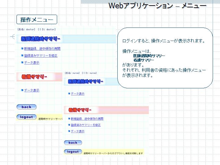 図2はWebアプリケーションのメニュー画面。ログインすると利用資格にあった画面が表示される。