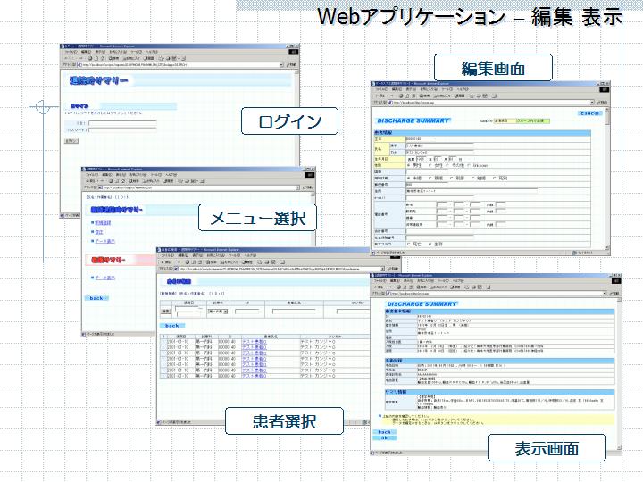 図3はWebアプリケーションの編集・表示画面。ログインしメニューから業務を選択、次に患者選択し編集画面へ移る。