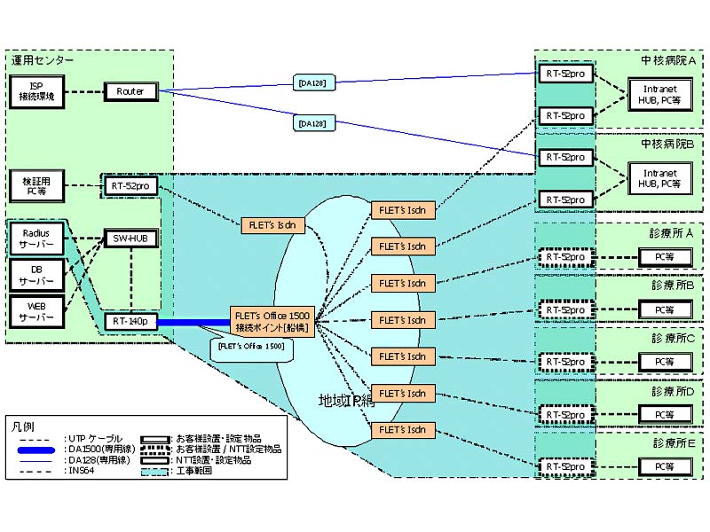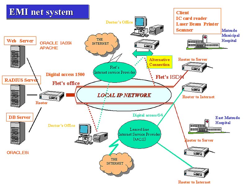 松戸市コンピュータサービスが提供するサーバ内にOracleでデータベースを作成し、これと各施設のクライアントが地域IP網で結ばれたASPを基本としている。各医師は端末に指紋認証でログインしたのちWebベースで情報をサーバにアクセスする。