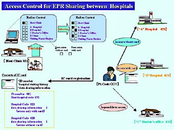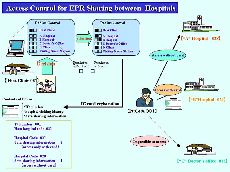 一度このカードで接続共有された医師は、キードクターがとくに加入処置をとらなくてもその後は共有関係で結ばれる。このように患者本位で接続する施設は限定され、必要により拡大する方向で設計されている。EMInetへの記録は相互に開示することを原則として書かれており、共有関係にある他の施設の医師がデータを患者に開示することを許可している。