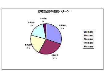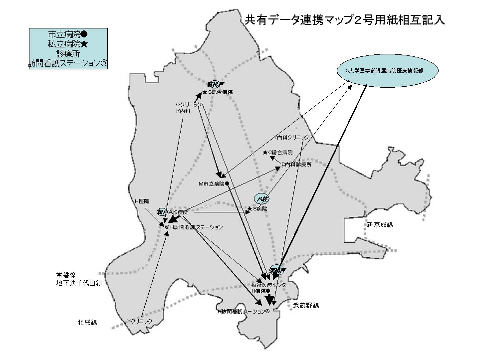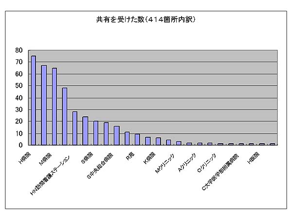 共有関係414のうち、実際に双方から記入があった33患者の関係を地図に示す。またこれを連携で分類すると診看、病診、病病連携の順になり、僅か2施設ではあるが、訪問看護ステーションとの係りの深いことが示されている。共有設定数は1ないし2施設が大半である。これはICカードをもてば患者はいつでも自由に病院を選択できることが可能であることも関係しているであろう。