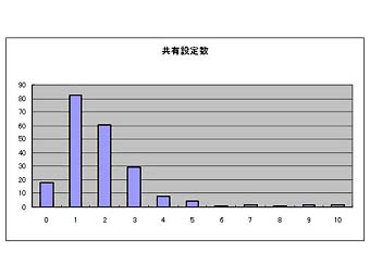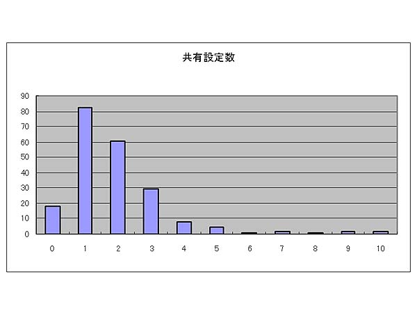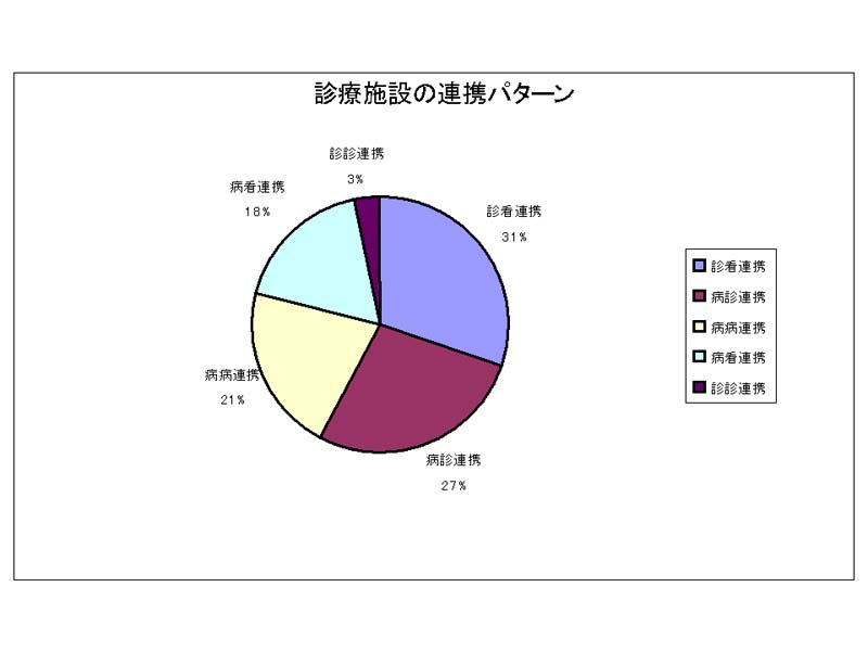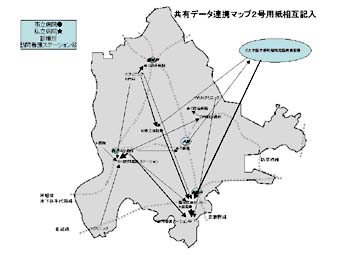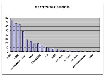 共有関係414のうち、実際に双方から記入があった33患者の関係を地図に示す。またこれを連携で分類すると診看、病診、病病連携の順になり、僅か2施設ではあるが、訪問看護ステーションとの係りの深いことが示されているといえよう。共有設定数は1ないし2施設が大半である。これはICカードで患者がのちに自由に選択できることが可能であることも関係しているであろう。
