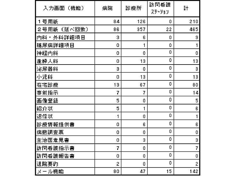 診療側が利用した資料の中では経過を記録する2号用紙の利用が診療所では3倍で、診療所での利用頻度の高いことが分かる。また詳細項目の中では在宅診療が特に利用されている。紹介状などの書類については印刷操作に十分習熟されていないためであろう。