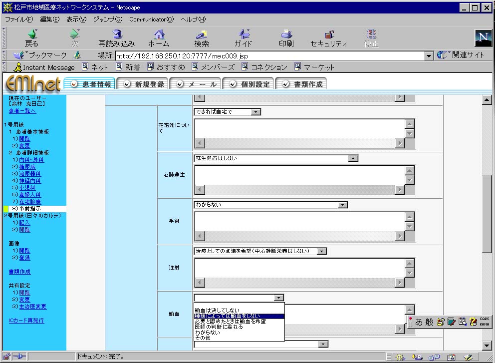 また事前指示については項目ごとに入力し、患者あるいは家族に記入させる。これにより松戸市のどの病院に入っても事前指示書を参考にした医療が行なわれる可能性がある。