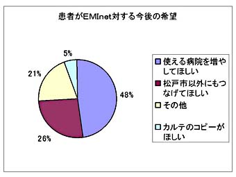 EMInetが今後発展するか否かは医師会以外に市、市立病院その他関係する機関の認識が大いに関係する。財政的なバックアップが必要であるし、特に登録する側よりも患者さんを受け入れる側の認識が重要である。しかしながら万一松戸市においての発展が期待できないとしても、今回のシステムにおける共有に関する考え方はより広域においても実現可能な方法の一つではないかと考えられる。そしていずれ遅かれ早かれわれわれは全国レベルでの共有設定方法が必要となるであろう。