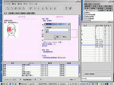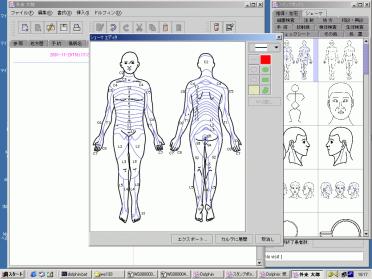 カルテ記載用のスタンプ(右)が豊富に準備され、処方、検査、図(テンプレート)などが利用出来る。図は、シェーマをもとに、簡単なスケッチを記録している画面。