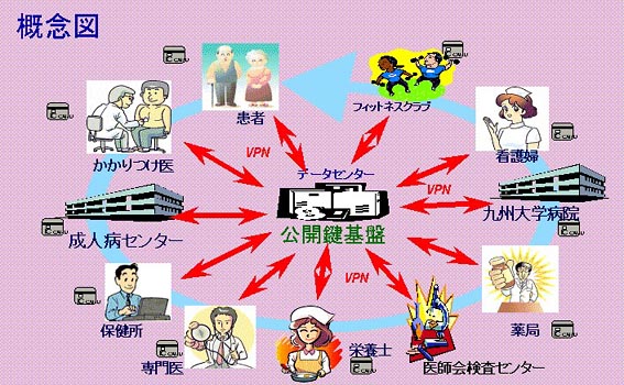 福岡市地区では、平成13年度に財団法人医療情報システム開発センターによる「先進的IT技術を活用した地域医療ネットワーク公募事業」で、「公開鍵基盤を利用した広域分散型糖尿病電子カルテ開発事業」を福岡市医師会と九州大学医学部附属病院の共同事業として行った1。この事業では、地域医療ネットワーク構築の最大の課題であるセキュリティと標準化を重視し、公開鍵基盤(PKI)を用いた高度なセキュリティの確保とHL7version3 RIM準拠による医療情報の標準化を実現した。平成14年度以降は、福岡市医師会において、診療現場の使用に耐えうるシステム再構築に向けて検討中であるので、その動向を報告する。