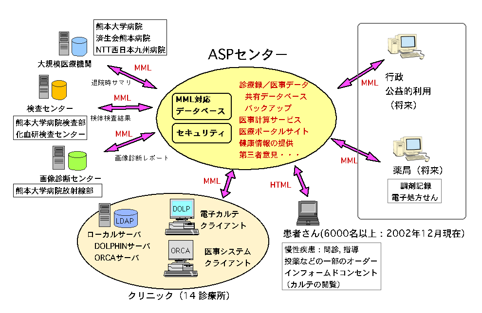 従来から熊本市では、医師会を中心に、医療のIT化による患者サービスの向上を目的としてWWW(ホームページ)、電子メイルによる連絡網の整備、救急医療体制のサポート(ベッド管理など)が精力的に行われていたが、正確で効率的な地域連携医療を実現するためには、「カルテ」「紹介状」「検査データ」を医療機関を越えて安全に共有する仕組みが必要であった。また、患者様への直接的なITサービス(カルテの参照、書き込み、ドクターとの連絡、薬局との連携など)も必要との考えられていた。この推進事業がアナウンスされ、かねてから計画していた地域医療情報ASP構想を具体化し、宮崎、熊本両地域から各々申請を行い、幸いにも両者共に採用された。もともと技術的には双児の兄弟のような両プロジェクトであることから、地域ASPセンター、クリニック用電子カルテなどは共通利用が可能である。そこで、共通利用可能なシステムに関しては共同開発を行うこととなり、DolphinProject[1]としてスタートした。熊本、宮崎県境での人的交流も盛んなことから、将来は県域を越えた医療情報の共有を目指す。