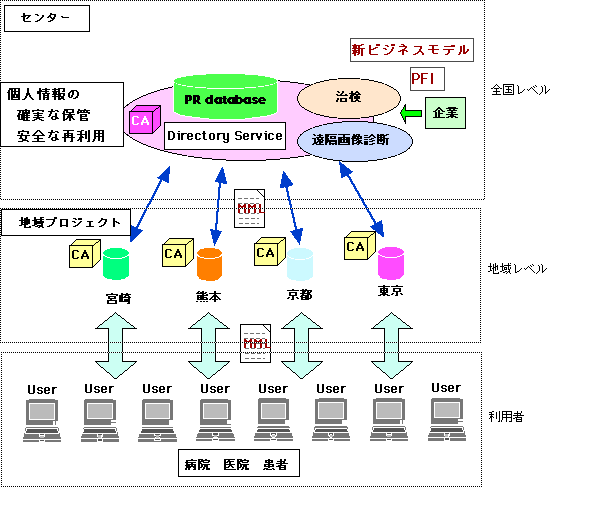 電子カルテの普及を背景に、地域における連携医療の実現のため、地域ごとに医療情報センターを設置し、このセンターをハブとしたデータの交換・共有を行う。このコンセプトは、98年に吉原が提唱し、2000年の経済産業省研究開発プロジェクトで実現の第一歩を踏み出した。その後、2001年12月には、熊本、宮崎の2地域で実験的なサービスが開始され[1, 2, 3]、2004年4月からは本格的サービスへと移行している。