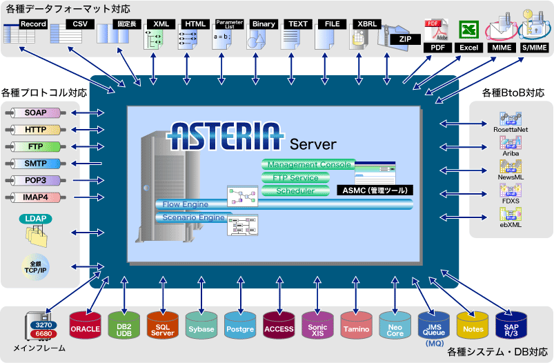 マルチプロトコル&マルチフォーマット対応のデータ連携ミドルウェアです。 → 製品に関する詳しい情報は、こちらのWebサイトでご確認ください ■Seagaia Meeting 2005 において 展示ブースでは、ASTERIAが持つ豊富なデータ連携機能をデモを交えてご紹介いたします。XMLとその他のデータ形式(Record、CSV、固定長、Excel)との相互変換をGUIベースで定義し、システム間連携のイメージをその場で体感いただきます。