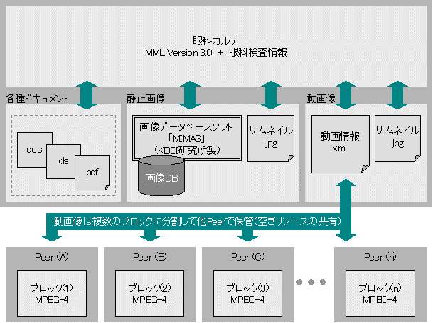 共有対象とする医療情報を,眼科カルテ(テキスト),検査画像(静止画像),手術映像(HDTV動画像),ドキュメントファイル(doc,pdf,xlsなど)の4種類とした.眼科カルテは,MML Version 3.0[5]に眼科特有の検査情報を独自に追加したものとし,MML中に記述した外部参照情報から各種画像やドキュメントファイルの所在を把握できる構成とした(図2).なお,病名や手術処置名などの医療用語には(財)医療情報システム開発センター[6]が提供する標準マスターを使用した.また,各Peerで管理するコンテンツの安全性を確保するため,MMLを暗号化した状態で保存することとした[7].