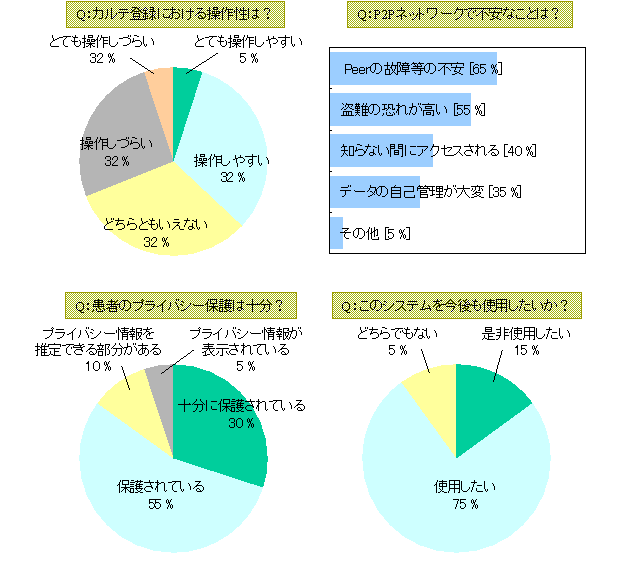 アンケート結果の一例を図5に示す.今回の実証実験によって,患者のプライバシー保護やシステムの操作性などに関する課題を解決すれば,P2Pネットワークによる医療情報の共有が実現可能であることを確認することができた.