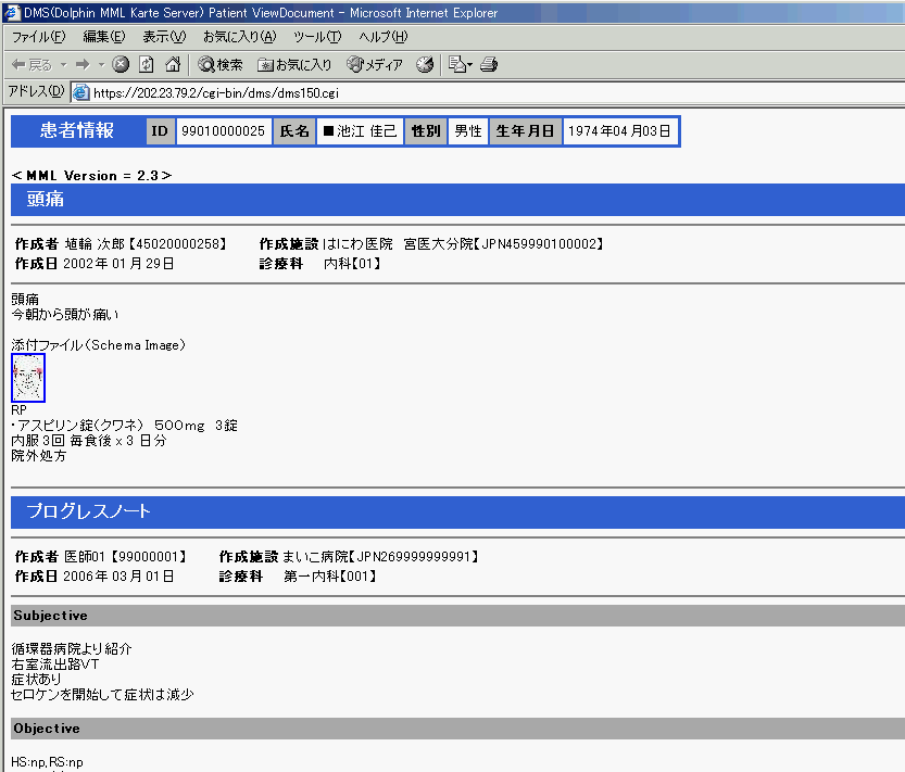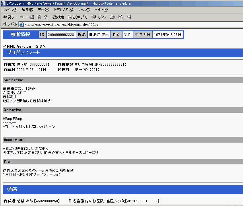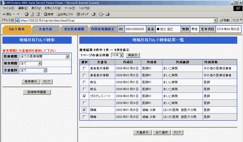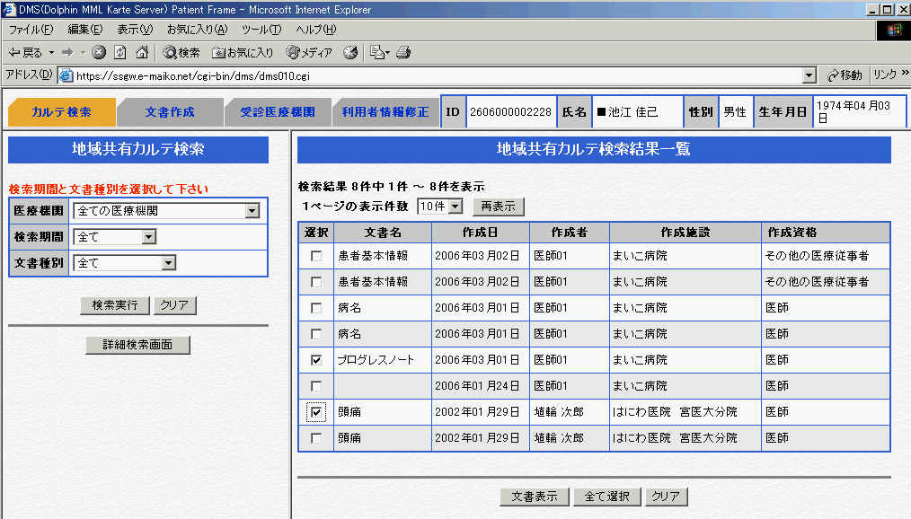 図3 図2のリストから文書を表示させた画面。宮崎サイトはMML2.3を使っているが、DataMappingが機能しているので、まいこ病院作成文書(HL7)も正しく表示されているのが判る。図4 京都サイト(まいこセンター)に、池江佳己(ID:2606000002228)でアクセスし、文書リストを取得した画面。リストには、宮崎(はにわ)センターの文書が2つ含まれているのが判る。